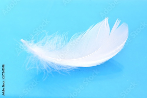 © andreynov, Obraz premium Light soft white bird feather on blue background with reflection. Close up