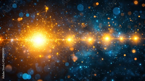 © mlangsen, Fototapeta premium Light streaks, dots, & networked lines on a dark blue backdrop. Bokeh effects