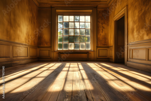 © Sekai, Obraz premium Light Streams into an Abandoned Corridor Creating Moody Architectural Shadows