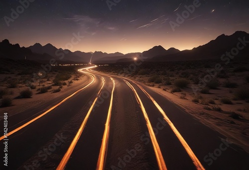 Fototapeta premium Light trails in the darkness of a desert landscape, rock formations,...