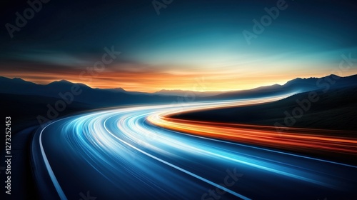 © michnik101, Naklejka premium Light trails on highway against sunset and mountain landscape. speed and technology