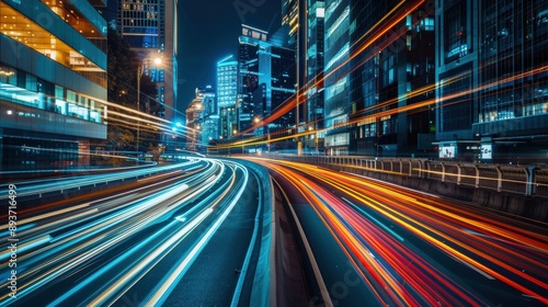 Fototapeta premium Light trails on the modern building background. Light trails at night in urban environment, Abstract Motion Blur City, traffic, transportation, street, road, speed