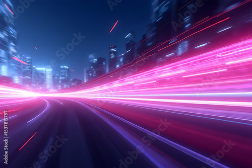 © NisatFarjana, Obraz premium light trails on the road Cosmic Neon Tunnel in Motion Radiating Pink and Blue Light Beams Simulate Speed Travel, Great for Tech Themes, Intros, or Visual Effects