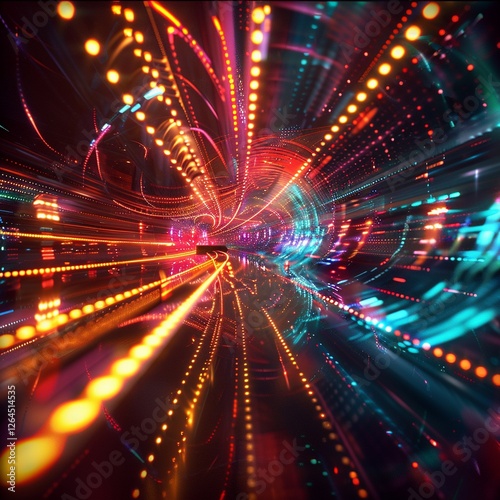 © illust_unibot, Naklejka premium Light trails with curve distortion and perspective angle on cyberpunk abstract background.