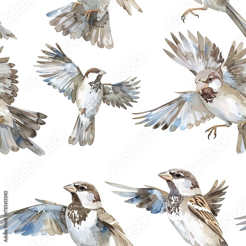 © Thanthara, Fototapeta premium Light watercolor sparrows, seamless sky pattern, small and free. Seamless pattern, Fabric Pattern, Tumbler Wrap, Mug Wrap.