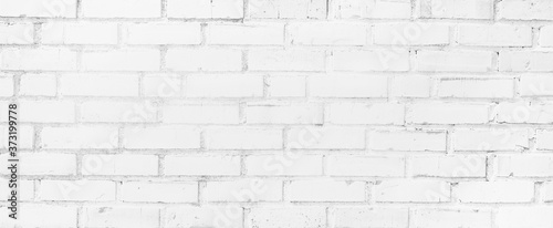 Fototapeta premium Light white black and gray horizontal brick wall. Old uneven textured surface on a building in the city. Urban background in grayscale. White painted bricks.