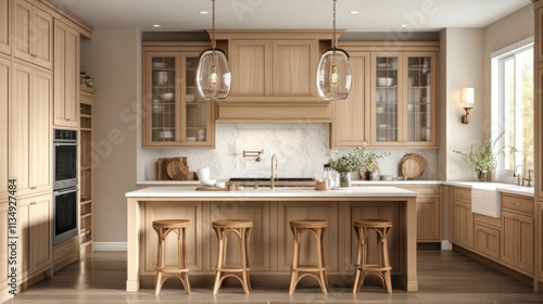 Fototapeta premium Light wood kitchen with island, cabinetry, and pendant lights.
