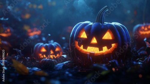 Fototapeta premium Lighted Blue Jack-o'-Lantern in a Spooky Forest