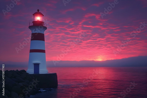 © Sri, Naklejka premium Lighted lighthouse on rocky coast at sunset, dramatic pink sky.