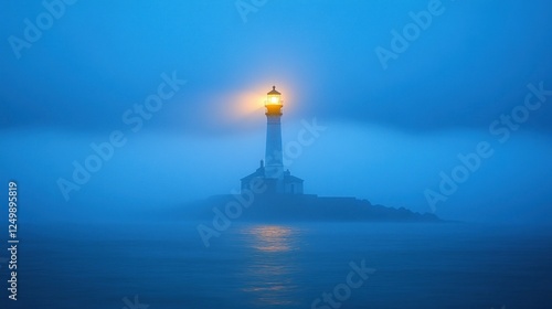 © Biancaart, Fototapeta premium Lighted Lighthouse Stands Tall In Misty Ocean