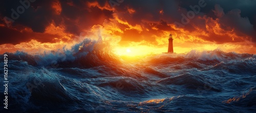 © Azis Stock, Obraz premium Lighthouse amidst stormy ocean waves during dramatic sunset.