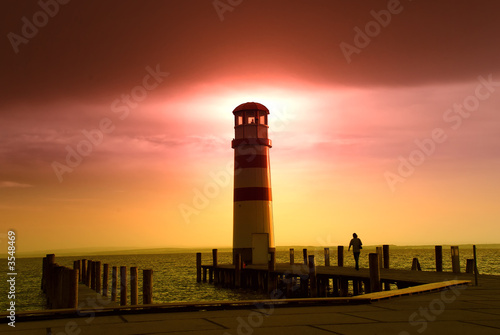 © Kurt Tutschek, Obraz premium Lighthouse at an Austrian lake with a woman walking towards it