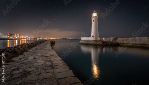 © Anak, Obraz premium Lighthouse at night, reflecting on calm water