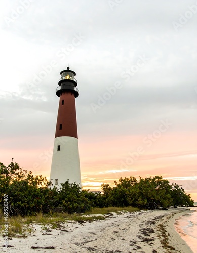 Naklejka premium Lighthouse at sunrise over a beach