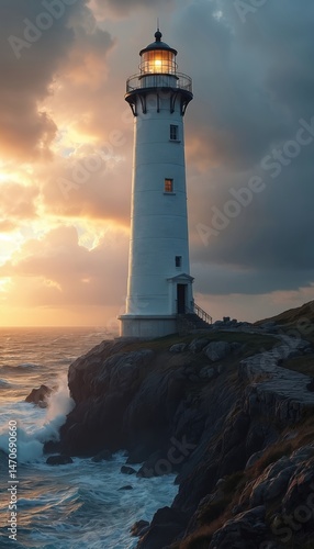 Naklejka premium Lighthouse at sunset on rocky coast. Beacon of light guides ships through ocean storm. Dramatic sky, sea waves crash against rocks. Travel to ocean, adventure, freedom, path, hope.