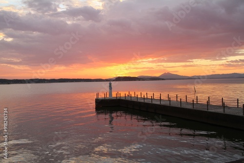 © SK, Obraz premium Lighthouse at Sunset with Colorful Sky and Lake Reflection in Japan