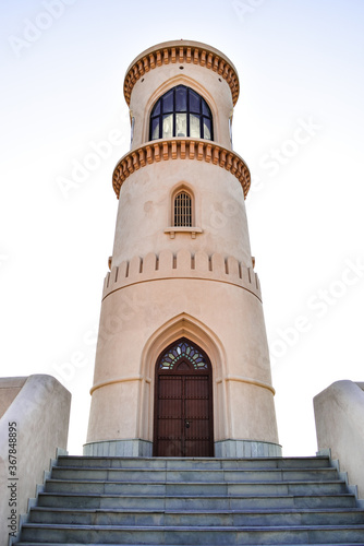 Fototapeta premium Lighthouse at the top of the stairs, in Al Ayjah, Sur, Oman. On the door,...