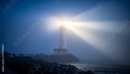 © surya, Fototapeta premium Lighthouse Beam Piercing Foggy Night