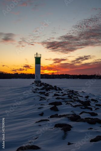 © Garry, Fototapeta premium Lighthouse in frozen lake at sunset, Ontario, Canada