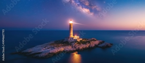 © indirah, Fototapeta premium Lighthouse on Rocky Island Under Starry Night Sky