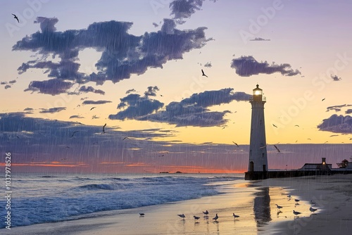 © Valentin, Fototapeta premium Lighthouse on the beach at morning dramatic sky