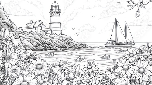 Fototapeta premium Lighthouse scene with sailboat and flowers, coloring book illustration, printable art
