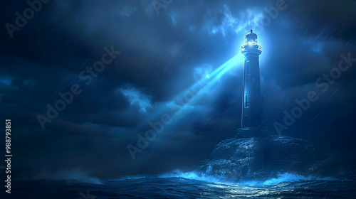 Fototapeta premium Lighthouse Shining Through Stormy Sea at Night