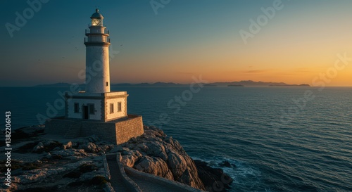 Naklejka premium Lighthouse Sunset Seascape: Coastal Serenity at Golden Hour
