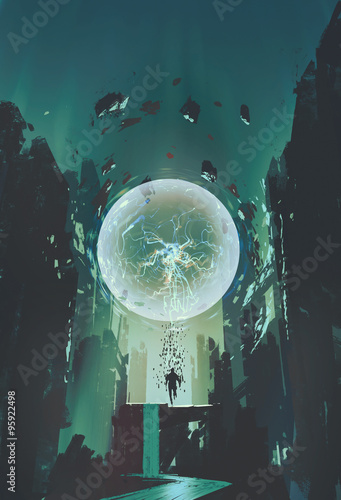 Fototapeta premium lightning ball and geometry in the form of human with building background,illustration painting