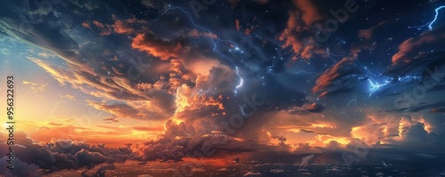 © Настя Шевчук, Fototapeta premium Lightning bolts dancing across twilight sky, 4K hyperrealistic photo