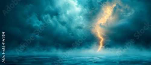 © Mikus, Obraz premium Lightning bolts in cloudy sky, above water with a boat in foreground