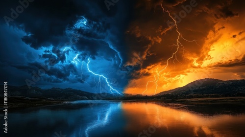 Naklejka premium Lightning bolts over a lake with dark and orange clouds, for media projects