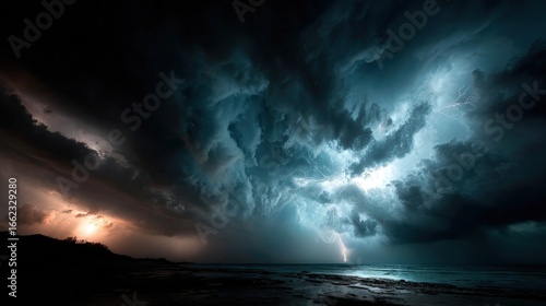 Naklejka premium Lightning bolts striking the sea under dark stormy clouds during a dramatic...