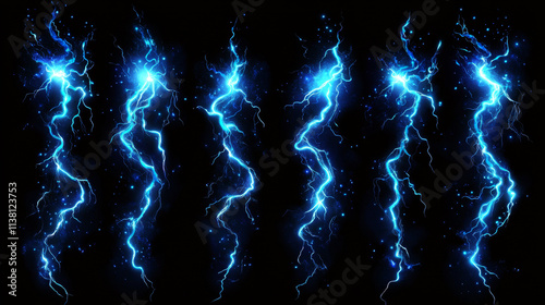 © Sahraya, Obraz premium Lightning, electric thunderbolt strike of blue color during night storm, impact, crack, magical energy flash. Powerful electrical discharge, Realistic 3d vector bolts set isolated on black background
