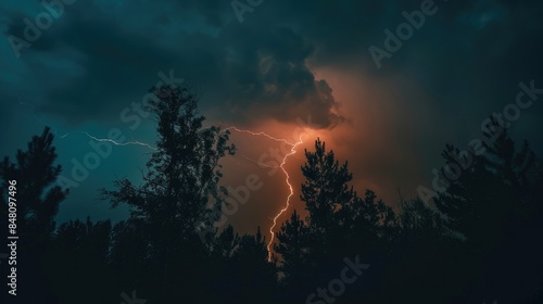 © The 2R Artificiality, Fototapeta premium Lightning flashing amidst dark night skies over the trees