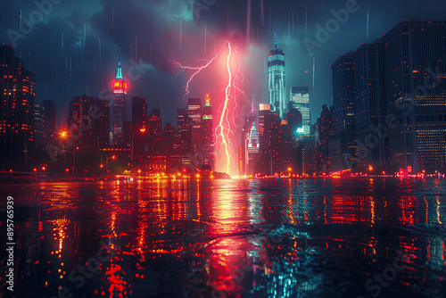 Fototapeta premium Lightning Storm Flashing Over a Neon-Lit Metropolis: Urban Energy Unleashed