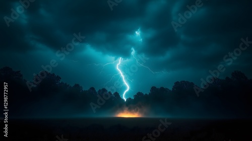 Obraz premium Lightning strike in dark stormy forest