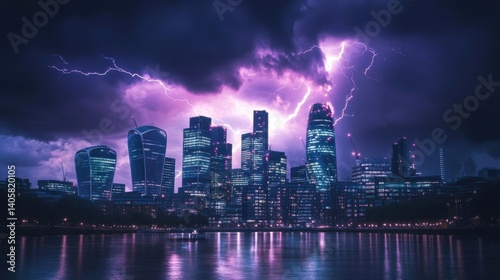 Fototapeta premium Lightning strikes above a modern city skyline during a dramatic night. Dark clouds cover the buildings with striking purple hues.