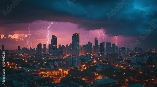 © Penatic Studio, Fototapeta premium Lightning Strikes Over a Cityscape at Night