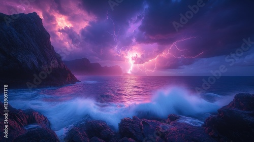 © logyartstudios, Fototapeta premium Lightning strikes over ocean at dusk.