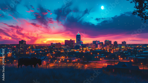 © Thiago, Fototapeta premium Lights blue buffalo skyline. Twilight Horizon Glow. Illustration