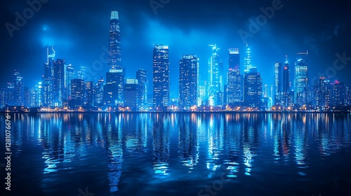 Fototapeta premium Lights illuminate a high-tech oil refinery at night, offering a panoramic scene