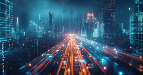 Fototapeta premium Lights of cars moving in the futuristic city.