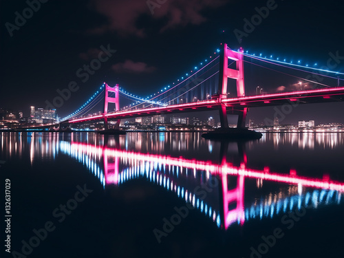 Fototapeta premium Lights on the bridge reflecting on rippling water, neon city mirroring perfectly at night
