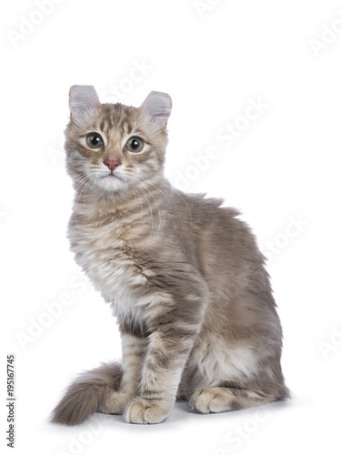 © Nynke, Obraz premium Lilac blotched tabby American Curl cat / kitten sitting side ways looking straight to the camera isolated on white background.