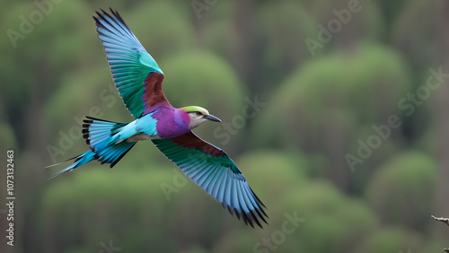 © Rabia, Fototapeta premium Lilac breasted roller flying over the forest, AI Generated