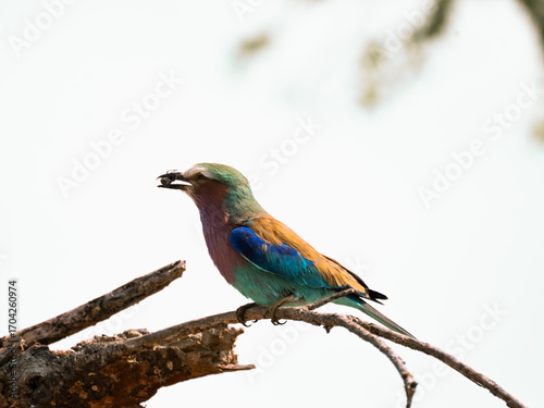 © Thomas, Fototapeta premium Lilac-breasted roller perched on a branch with an insect in its beak in Tanzania’s savanna.