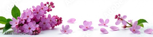 © suchetpong, Obraz premium Lilac flowers isolated on white background with some green leaves, fresh, petals