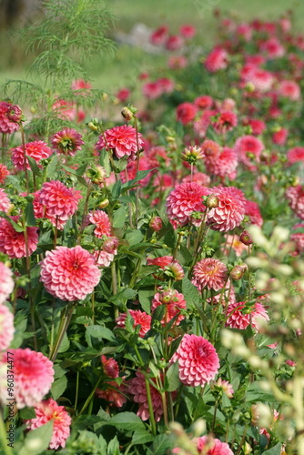 © SHARKY PHOTOGRAPHY, Obraz premium Lilac purple decorative dahlia in the garden. Blossoming pink dahlias, floral background