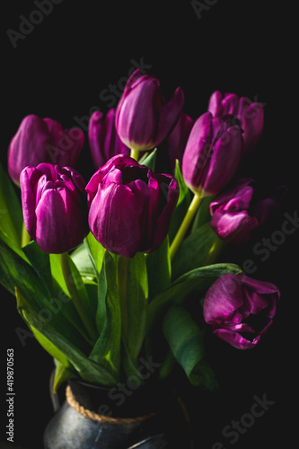 © Iryna Obertun, Fototapeta premium Lilac purple tulip flowers on table. Spring bouquet flowers in vintage vase. Floral concept. Floral background. Dark black background.